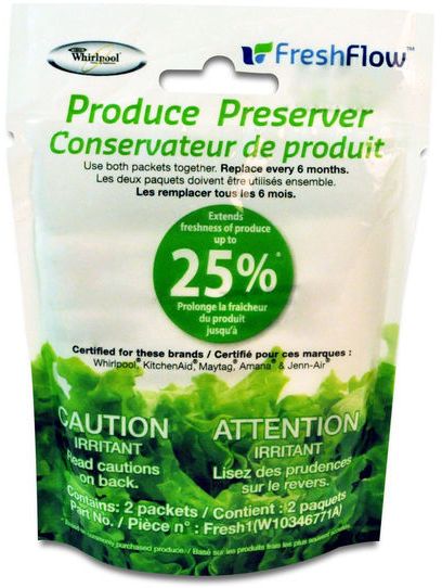 Produce preserver absorbs ethylene allowing the ripening process of many produce items to slow down. As a results, certain produce items will stay fresh longer that are kept in your crisper drawer. It extends freshness of produce up to 25%. Packet contains two pouches which will be put in the housing in your crisper drawer. Packet also contains a status indicator to help you remember to change the pouches. Replace pouches and status indicator every six months for optimal freshness.